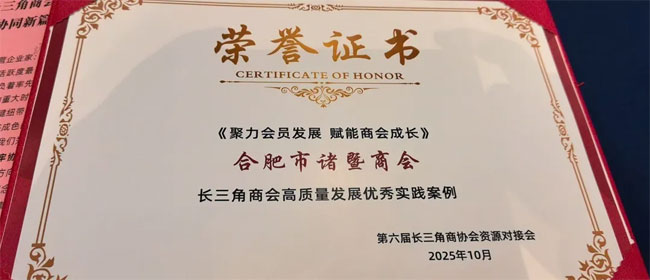 此次参会让合肥市诸暨商会收获了荣誉与认可,更吸收了高质量的发展经验。未来,商会将持续秉承服务宗旨,深化内外联动,助力会员企业创新提质,为推动合肥与诸暨两地经济交流、服务长三角一体化发展贡献更大力量。